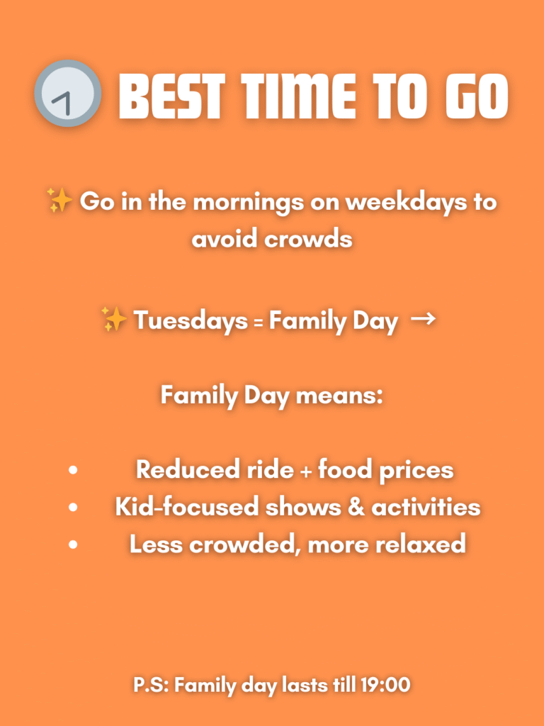 Small backpack + essentials (snacks, water, wet wipes) | Lines + kid energy = need to refuel often |