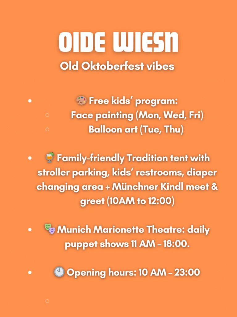 - Weekdays & mornings/early afternoons are your best friends. Fewer crowds, more breathing room, easier with toddlers. Wiesn officially opens around 10 a.m. most days.